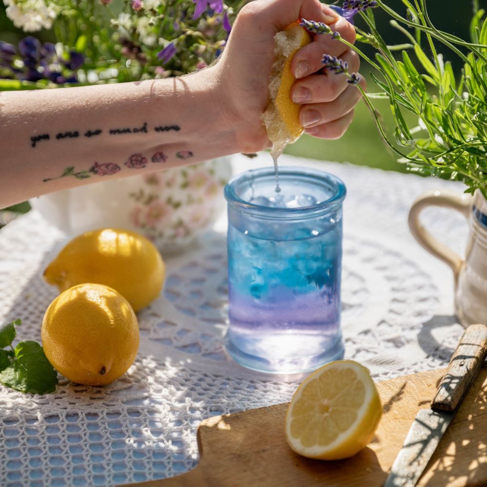 minútach sa nápoj zafarbuje modro, aby nakoniec získal jedinečnú prírodno modrú farbu. Pripravuje